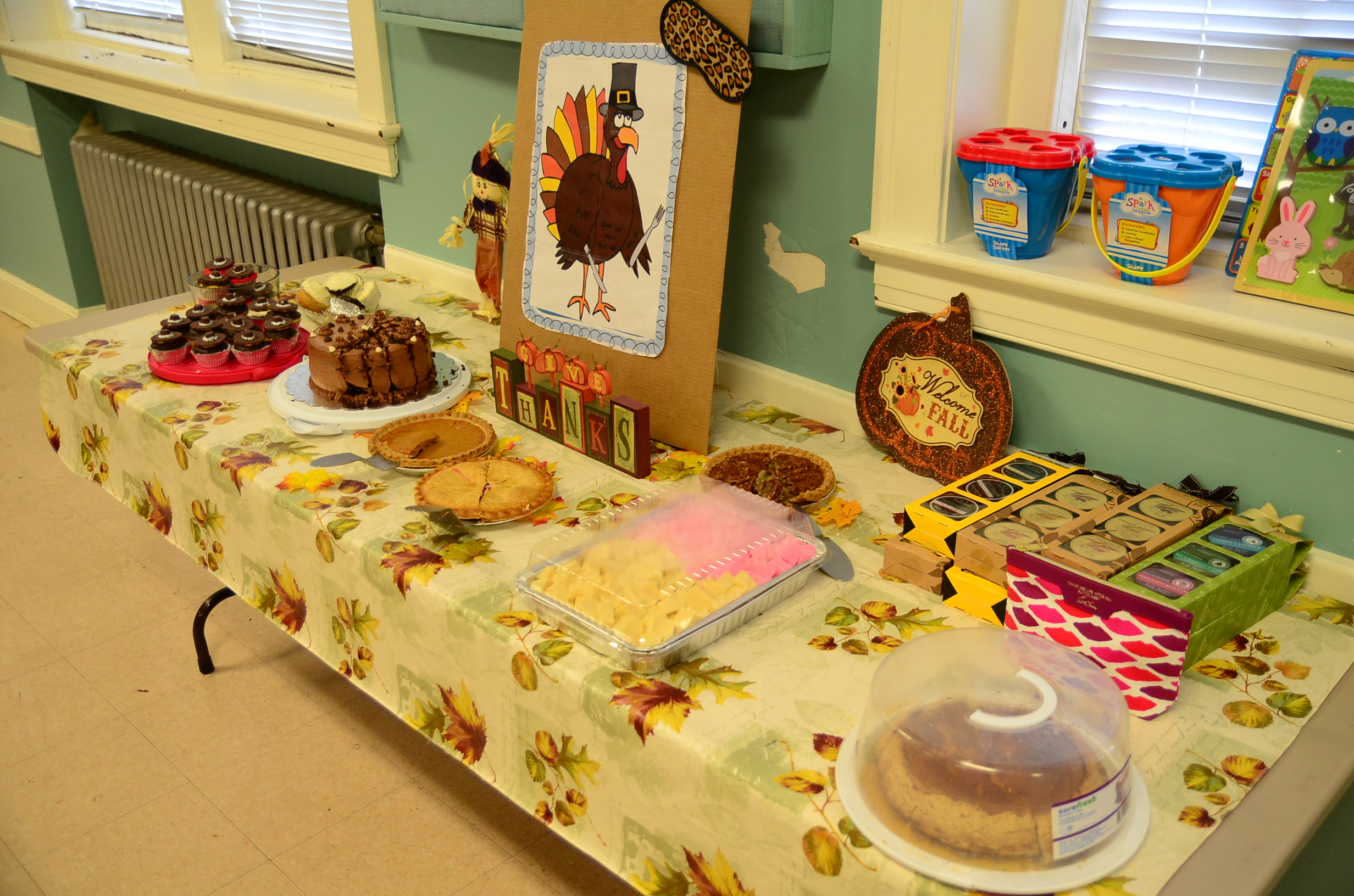 The weather outside painted a grim winter scene, full of cold rain and wind, but the fellowship hall at Church of the Covenant Presbyterian reminded everyone of fall with warm decor including leaves, pumpkins, and turkeys scattered around; even pieces of art done by the children were displayed.